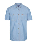 Mens Short Sleeve Industrial Chambray Shirt, Classic 5045 Fit, Placket Front, Button Down Collar, Double Pockets, Tortoise Shell Buttons, Trademark Suede Pen Pocket Detail