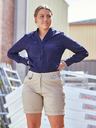 - Stretch mid rise fit with curved waistband for comfort and movement
